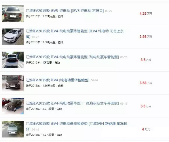 江淮iEV系列挺好賣,其中比較低端的iEV4北京成交價在6.2-6.5萬元左右。再看看這些去年登記的車,只能賣3、4萬!