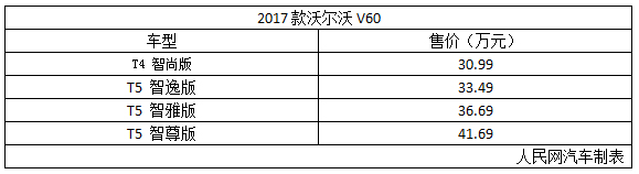 人民網(wǎng)北京8月5日電(涂欽瀚)近日,筆者從沃爾沃官網(wǎng)獲悉,2017款沃爾沃V60正式上市,新車將提供4款車型,售價(jià)區(qū)間依舊是30.99-41.69萬元。