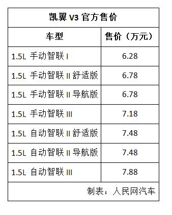 人民網(wǎng)北京8月8日電(曹淼)今日,凱翼全新SUV凱翼V3正式上市。新車共推出7款車型,售價區(qū)間為6.28萬-7.88萬元。新車面對年輕消費(fèi)者群體,搭載1.5L發(fā)動機(jī),與發(fā)動機(jī)匹配的是手動和自動變速箱。