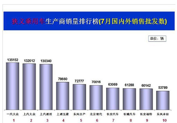 在7月份狹義乘用車生產(chǎn)商銷量前十名的車企中,一汽大眾、上汽大眾和上汽通用勢(shì)均力敵,獲得銷量前三甲。