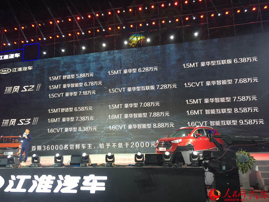 人民網(wǎng)北京9月21日電(鄂智超)日前,江淮汽車正式宣布,旗下新款瑞風(fēng)S2與S3車型正式上市。其中新款瑞風(fēng)S2車型推出搭載1.5L發(fā)動機的共7款車型,售價區(qū)間為5.88萬至7.68萬元;新款瑞風(fēng)S3車型推出搭載1.5L/1.6L兩款動力的共9款車型,售價區(qū)間為6.58萬至9.58萬元。在發(fā)布會現(xiàn)場,江淮宣布針對首批三萬六千名新車用戶提供“品鮮惠售”政策,可享受2000元的優(yōu)惠禮包。