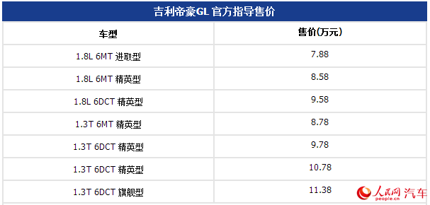 售7.88萬- 11.38萬元 吉利帝豪GL正式上市