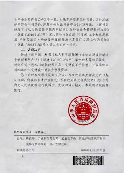 針對上述問題,根據(jù)相關(guān)規(guī)定,對力帆乘用車上述2395輛新能源汽車中央財政不予補(bǔ)助,并取消該公司2016年中央財政補(bǔ)助資金預(yù)撥資格。