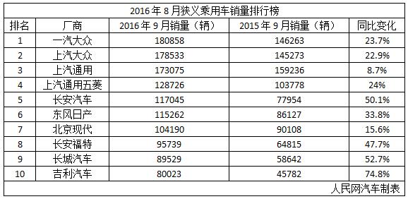 數(shù)據(jù)顯示,9月份國內(nèi)狹義乘用車銷量前十名車企名單和8月份保持一致。前三名車企中,一汽-大眾依然穩(wěn)坐冠軍寶座,上汽通用被上汽大眾趕超,跌至第三名,其余7個席位均與上個月保持一致。從同比增幅情況來看,9家車企增幅均達兩位數(shù),其中8家增幅超過20%,甚至有3家車企銷量增幅突破50%。這樣的銷量成績主要由于今年9月有21個完整連續(xù)的工作日,相對去年9月的閱兵+月餅的前后雙節(jié)日特征,今年9月更有利于產(chǎn)銷增量。另外國慶假期是今年中最后一個高速免費的小長假,加上秋冬季價格回升和購置稅優(yōu)惠到期的雙重推動造成了早買更合算的現(xiàn)象。