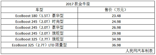 人民網(wǎng)北京10月21日電(涂欽瀚)近日,長安福特宣布2017款金牛座正式上市,新車將推出3種排量共6款車型,售價區(qū)間為23.48-36.98萬元。