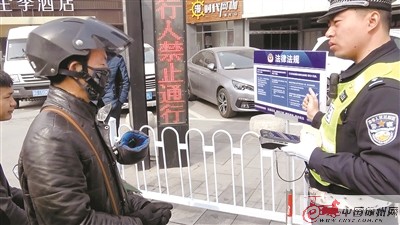 右圖 民警向違法駕駛?cè)私忉尫菣C(jī)動(dòng)車走機(jī)動(dòng)車道的危害及處罰的法律依據(jù)。