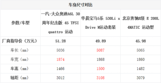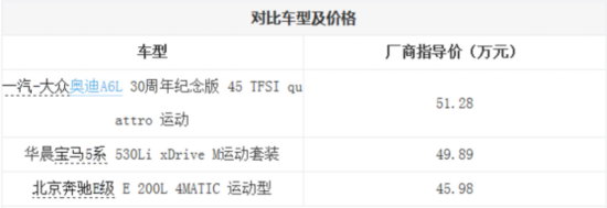 這次我們就選擇了A6L、5系和E級,這三款BBA的“掌門人”來過過招,具體車型分別是:一汽-大眾奧迪A6L 30周年紀(jì)念版 45 TFSI quattro 運(yùn)動、華晨寶馬5系530Li xDrive M運(yùn)動套裝和北京奔馳E級E 200L 4MATIC運(yùn)動型。需要說明的是雖然A6L的指導(dǎo)價最高,但是它目前全系都有著不小的市場優(yōu)惠,參與對比的A6L就有著接近十萬元的市場優(yōu)惠幅度。因此就車輛的終端價格來看,A6L相比5系和E級還是有優(yōu)勢的。