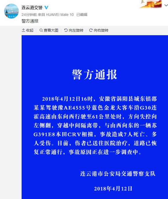 人民網(wǎng)連云港4月12日電 (閆峰)4月12日16時(shí),連霍高速連云港段發(fā)生一起交通事故,一輛大客車(chē)失控側(cè)翻,與一輛小轎車(chē)相撞。連云港市公安局交通巡邏警察支隊(duì)官方微博@連云港交警通報(bào)稱(chēng),事故造成7人死亡,多人受傷。目前傷者已送往醫(yī)院治療,道路恢復(fù)正常通行,事故原因正在進(jìn)一步調(diào)查。