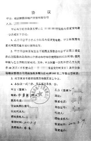 在李先生提供的這份協(xié)議書(shū)復(fù)印件上可以看到,開(kāi)發(fā)商棲霞房地產(chǎn)開(kāi)發(fā)有限公司和李先生達(dá)成了協(xié)議,第二條寫(xiě)道:“甲方(開(kāi)發(fā)商)同意將原規(guī)劃總平面圖及預(yù)售合同總平面圖上設(shè)定在乙方(李先生)院落西北角的三個(gè)機(jī)動(dòng)車(chē)停車(chē)位使用權(quán)歸乙方所有,使用年限與乙方所購(gòu)房屋相同。”并蓋上了公司的公章和法定代表人的印章。