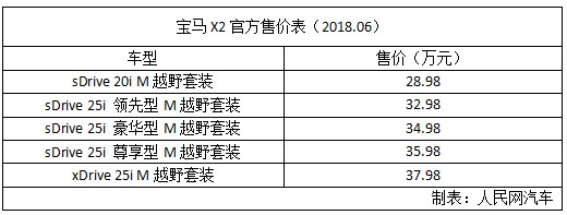 人民網(wǎng)北京6月26日電(鄂智超)日前,寶馬宣布旗下進(jìn)口全新X2在國(guó)內(nèi)市場(chǎng)上市,新車共推出5款車型,售價(jià)區(qū)間為28.98萬-37.98萬元。