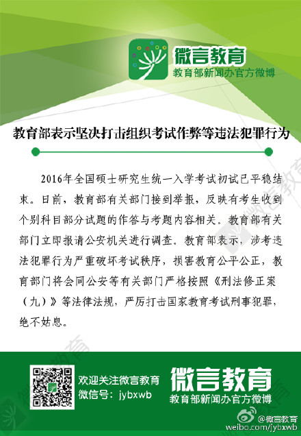 2016年全國碩士研究生招生考試于12月26日開考,日前,教育部通過官方微博稱,有關(guān)部門接到舉報反映有考生收到個別科目部分試題的作答與考題內(nèi)容相關(guān),教育部有關(guān)部門立即報請公安機(jī)關(guān)進(jìn)行調(diào)查。