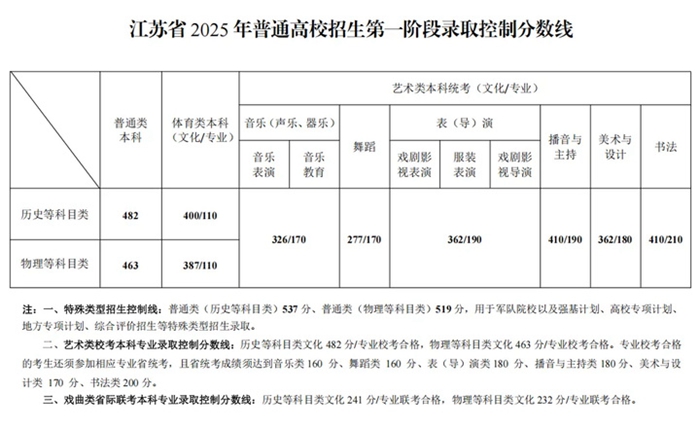 江蘇省普通類本科歷史等科目類分數(shù)線482分,物理等科目類分數(shù)線463分。