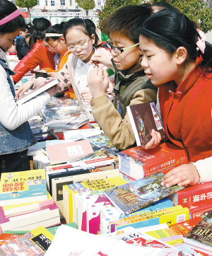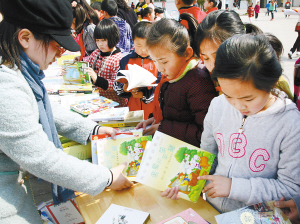 中午,銅小的操場上人聲鼎沸,全校學生們正舉行讀書節(jié)系列活動之“淘寶書市”。書市上,同學們既可以以書換書,又可以低價淘到自己喜歡看的書。