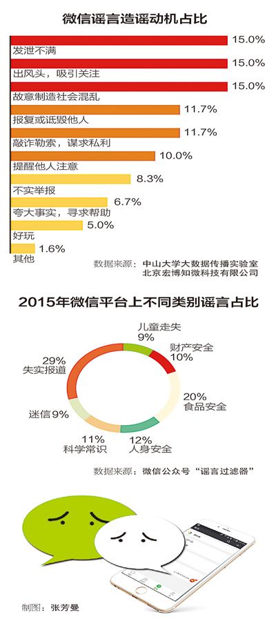 微信官方推出的公眾號(hào)“謠言過(guò)濾器”將謠言分為七類(lèi),分別為失實(shí)報(bào)道、兒童走失、財(cái)產(chǎn)安全、食品安全、人身安全、科學(xué)常識(shí)、迷信。數(shù)據(jù)顯示,2015年失實(shí)報(bào)道所占比例最高,達(dá)到了29%,而排名第二、第三的分別為食品安全(20%)與人身安全(12%)。《倒著輸銀行卡密碼能自動(dòng)報(bào)警》《長(zhǎng)期喝豆?jié){會(huì)致乳腺癌》等入選年度十大謠言,舉報(bào)次數(shù)最多的《微信朋友圈降權(quán)》達(dá)到了233210次。