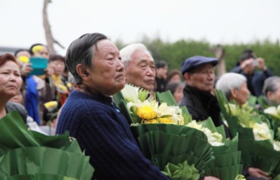 2016年4月4日,江蘇省南京市,南京大屠殺幸存者懷抱鮮花參加祭奠活動(dòng)