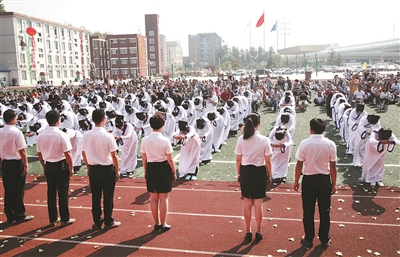 孔子弟子三千,賢者七十二。9點(diǎn)整,在入學(xué)禮司儀主持下,72名身著藍(lán)白漢服的學(xué)生出列,代表所有學(xué)子行入學(xué)大禮。入學(xué)禮是古代四大禮之一,包括正衣冠、誦讀詩詞、行拜師禮、朱砂啟智、擊鼓鳴志、跪拜父母等六項(xiàng)。蓼蓼者莪,匪莪伊蒿,哀哀父母,生我劬勞。當(dāng)司儀引領(lǐng)全體初一、高一新生到父母面前行跪拜之禮的剎那,很多父母都落淚了。徐州京師未來實(shí)驗(yàn)學(xué)校校長齊玉海介紹,“漢式入學(xué)禮”是徐州京師未來實(shí)驗(yàn)學(xué)校國學(xué)特色教育的重要組成部分,“我們在開學(xué)典禮上安排了這次具有深刻中國傳統(tǒng)文化底蘊(yùn)的‘漢式入學(xué)禮’,寓意老師和學(xué)生一起,志與圣賢為伍,讓中華文化的精神從這莊重的儀式中深植于每個(gè)孩童的內(nèi)心。”