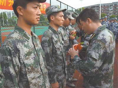 9月5日,揚州大學(xué)商學(xué)院6名在校大學(xué)生戴上大紅花跨進軍營,全院609名參加軍訓(xùn)的新生代表見證了學(xué)長的光榮時刻。 戚 源攝