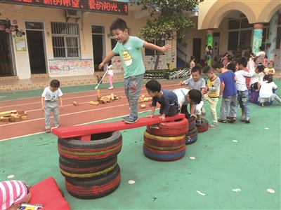 自課程游戲化實(shí)施以來,幼兒園著力改造與游戲活動(dòng)相適宜的環(huán)境。設(shè)計(jì)了長廊、沙池、水系、種植園、涂鴉區(qū),增添了草坪、攀爬設(shè)施等。除新增大型玩具、攀爬架、人字梯、炭化積木、桌面玩具外,充分挖掘豐富的地方資源,將安吉游戲理念融入其中,收集廢舊輪胎、紙箱等材料,經(jīng)過清洗和消毒,變廢為寶,供幼兒自主游戲。孩子們?cè)跊]有成人參與的情況下,自主地選擇這種低結(jié)構(gòu)的材料合作、探索、建構(gòu)、找尋替代物進(jìn)行游戲,發(fā)現(xiàn)問題,解決問題,既享受了戶外活動(dòng)的樂趣,又獲得了全面發(fā)展。