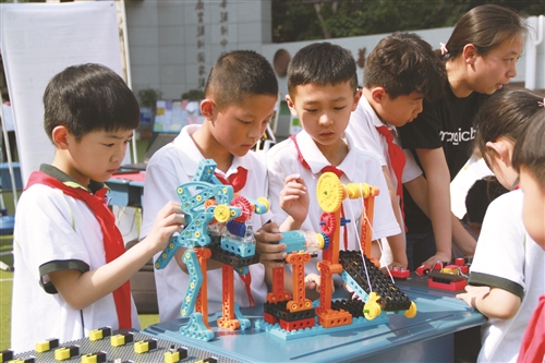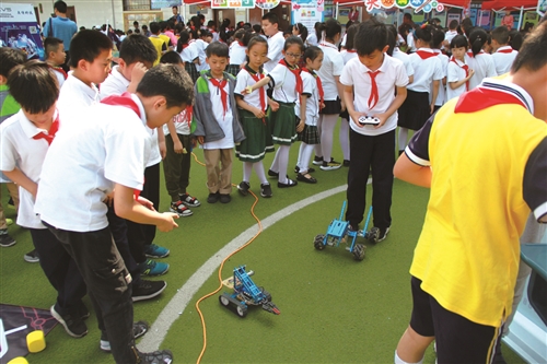 ◎文/圖 徐州日?qǐng)?bào)全媒體記者 劉蘇 通訊員 公宣 3D打印機(jī)是如何運(yùn)作的?玩轉(zhuǎn)一個(gè)小小的魔方,是否有規(guī)律?航模飛機(jī)飛上天的原理到底是什么?……這些孩子們常問的“為什么”,在公園巷小學(xué)慶六一科技游園會(huì)上都能找到答案。日前,為引導(dǎo)學(xué)生積極參與科技創(chuàng)新實(shí)踐和體驗(yàn)活動(dòng),倡導(dǎo)學(xué)生開展以動(dòng)手探究為主題的科技活動(dòng),培養(yǎng)學(xué)生創(chuàng)新思維、創(chuàng)新精神以及實(shí)踐探究能力,進(jìn)一步打造學(xué)校“科技教育”特色,公園巷小學(xué)舉辦了“科技潤(rùn)童心 奮進(jìn)新時(shí)代”六一科技游園會(huì),學(xué)校的科學(xué)老師和專業(yè)的科技工作人員帶領(lǐng)著學(xué)生們一起在體驗(yàn)與競(jìng)賽中學(xué)科學(xué)、用科學(xué)。 全員參與 體驗(yàn)動(dòng)手樂趣 公園巷小學(xué)的科技活動(dòng)堅(jiān)持“全員參與、點(diǎn)面結(jié)合”,比如在每個(gè)年級(jí)段設(shè)不同項(xiàng)目:一年級(jí)的葉畫,二年級(jí)用不同的材料制作帽子,三年級(jí)記錄鳳仙花的成長(zhǎng)歷程,四年級(jí)制作天氣日歷,五、六年級(jí)舉行科學(xué)素養(yǎng)知識(shí)競(jìng)賽。讓所有愛動(dòng)手動(dòng)腦、熱愛科學(xué)的孩子都有施展才華的天地。 “在我們的心中總有一個(gè)夢(mèng),夢(mèng)想有一天紙屑不再飄揚(yáng),塑料袋不再飛舞,天會(huì)更藍(lán)、水更清、樹更綠。”這個(gè)科技節(jié),二年級(jí)的小朋友們?cè)诎职謰寢尮餐膸椭伦灾髟O(shè)計(jì),大膽構(gòu)思,用靈巧的雙手,將廢舊的物品變成了一頂頂奇思妙想的帽子:有的是用可樂易拉罐縫起來的鴨舌帽,有的是用新年紅包粘成的“皇冠”,還有的是用自己畫過畫的卡紙做成的巫師帽……看到五花八門的手工絕活兒,看到家長(zhǎng)朋友們的配合和無窮智慧,在場(chǎng)的每一位老師都無比感動(dòng)。 手工帽的旁邊是三年級(jí)的鳳仙花展示。每盆“作品”旁邊都有一本成長(zhǎng)日志,記者隨手翻開幾本,不由得有些震動(dòng)。孩子們圖文并茂地記錄了鳳仙花從一粒種子到開花的成長(zhǎng)歷程,從溫度、到澆水量,到每個(gè)階段的保持時(shí)間,出現(xiàn)的問題、解決的方法都面面俱到。 “這次種植的失敗,讓我經(jīng)歷了最初的歡喜,也經(jīng)歷了漫長(zhǎng)的等待,迫使我不得不前前后后去反思,到底是哪里出了問題。我和媽媽百度了鳳仙花的習(xí)性、種植鳳仙花的注意事項(xiàng),一一排查原因,最后將目標(biāo)鎖定在了土壤上。”這是一本成長(zhǎng)日志上的一段話,可以看出,她真的在用心培育這個(gè)小生命。 “讓孩子種植鳳仙花,不是非得讓孩子們都成功,有一個(gè)孩子就在日志上寫道:‘我的鳳仙花死了,我很難過。’也沒有關(guān)系的,至少他體會(huì)到了什么是生命。”公園巷小學(xué)科學(xué)教師程老師告訴記者。 頭腦動(dòng)起來 科技飛起來 除此之外,科技節(jié)現(xiàn)場(chǎng)設(shè)置的展示和比賽,更是讓孩子們玩得嗨到爆?春⒆觽冇械娜宄扇海械膯诬娮鲬(zhàn)。疊杯挑戰(zhàn)桌前站著4排長(zhǎng)長(zhǎng)的挑戰(zhàn)隊(duì)伍。他們用耐心、細(xì)心,用塑料杯搭建起了層層高塔,一幕幕精彩的鏡頭,讓在場(chǎng)的老師和同學(xué)們贊嘆不已。 飛行表演區(qū)上,伴隨著動(dòng)感的音樂,兩架多旋翼無人機(jī)垂直升空,水平飛行、盤旋,隨即又從套環(huán)中鉆出,做出各種高難度花式飛行動(dòng)作,學(xué)生們都瞪大了眼睛,視線緊緊追隨無人機(jī),情不自禁地拍手稱贊。 據(jù)公園巷小學(xué)負(fù)責(zé)人介紹,steam教育、創(chuàng)客教育是國(guó)家教育改革的方向,現(xiàn)在全國(guó)許多中小學(xué)及高校都紛紛設(shè)立無人機(jī)課程,組建無人機(jī)社團(tuán),鍛煉學(xué)生的動(dòng)手能力、解決問題、團(tuán)隊(duì)協(xié)作等綜合能力,為無人機(jī)領(lǐng)域輸送全面的無人機(jī)人才。 在操場(chǎng)上,一件件在草地上跑的機(jī)器人吸引了很多孩子的目光。這些機(jī)器人都是老師帶著孩子們一起進(jìn)行編程研發(fā)的?粗鴻C(jī)器人或跑、或退、或轉(zhuǎn)圈圈,孩子們都露出了羨慕的眼光。一個(gè)看起來只有一年級(jí)的孩子更是大聲地叫道:“這個(gè)太酷了!我也要學(xué)做機(jī)器人!”這就是公園巷舉辦科技節(jié)的目的所在吧:讓孩子接觸到科技,并愛上科技。 “通過活動(dòng)不僅提高孩子們的動(dòng)手能力和團(tuán)隊(duì)協(xié)作能力,還能使學(xué)生在科技活動(dòng)中感受科技創(chuàng)新的魅力,使科技生活的種子在孩子們心中發(fā)芽。”五(1)班班主任董秀梅告訴記者,自從學(xué)生們知道科技競(jìng)賽的主題后,對(duì)競(jìng)賽的熱情很高,經(jīng)常利用課間、午休、放學(xué)后的時(shí)間討論如何設(shè)計(jì)參賽作品,還請(qǐng)教科學(xué)科目老師關(guān)于設(shè)計(jì)中的物理知識(shí)。 “能看到孩子們對(duì)科技產(chǎn)生興趣,思維也活躍了起來,作為家長(zhǎng)我們也高興。”一位學(xué)生家長(zhǎng)陳女士告訴記者,活動(dòng)前一個(gè)多星期,她陪孩子畫了一晚上的設(shè)計(jì)圖,“把書本理論運(yùn)用到實(shí)踐中,利用趣味競(jìng)賽的方式提升孩子對(duì)科學(xué)