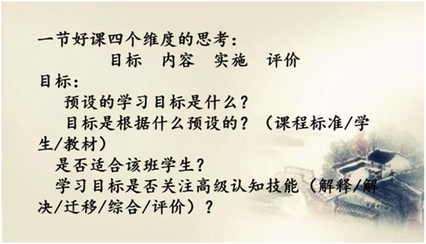 最后,魏老師給大家分享了自己的經(jīng)驗(yàn):每一個(gè)教學(xué)環(huán)節(jié)都應(yīng)該進(jìn)行反思,每一個(gè)環(huán)節(jié)都應(yīng)該追問。新教學(xué)最大的追求是它的教育意義,那么我的教育價(jià)值是什么?我的教育對(duì)學(xué)生的成長(zhǎng)具有什么意義?