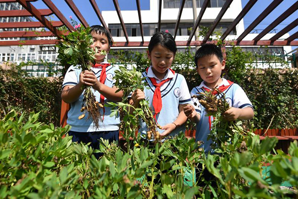 2025年9月16日,在山東省青島市市北區(qū)鞍山二路小學(xué)的種植園里,學(xué)生們?cè)诓烧斋@的花生。