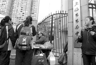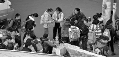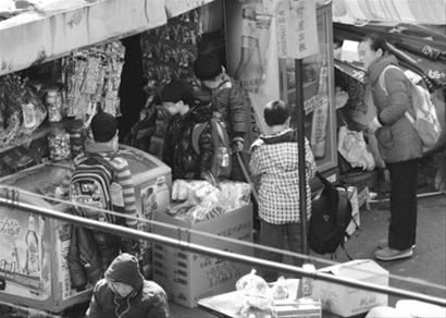 □放學(xué)后,不少學(xué)生圍在蒙古路上一個(gè)小攤販周圍。