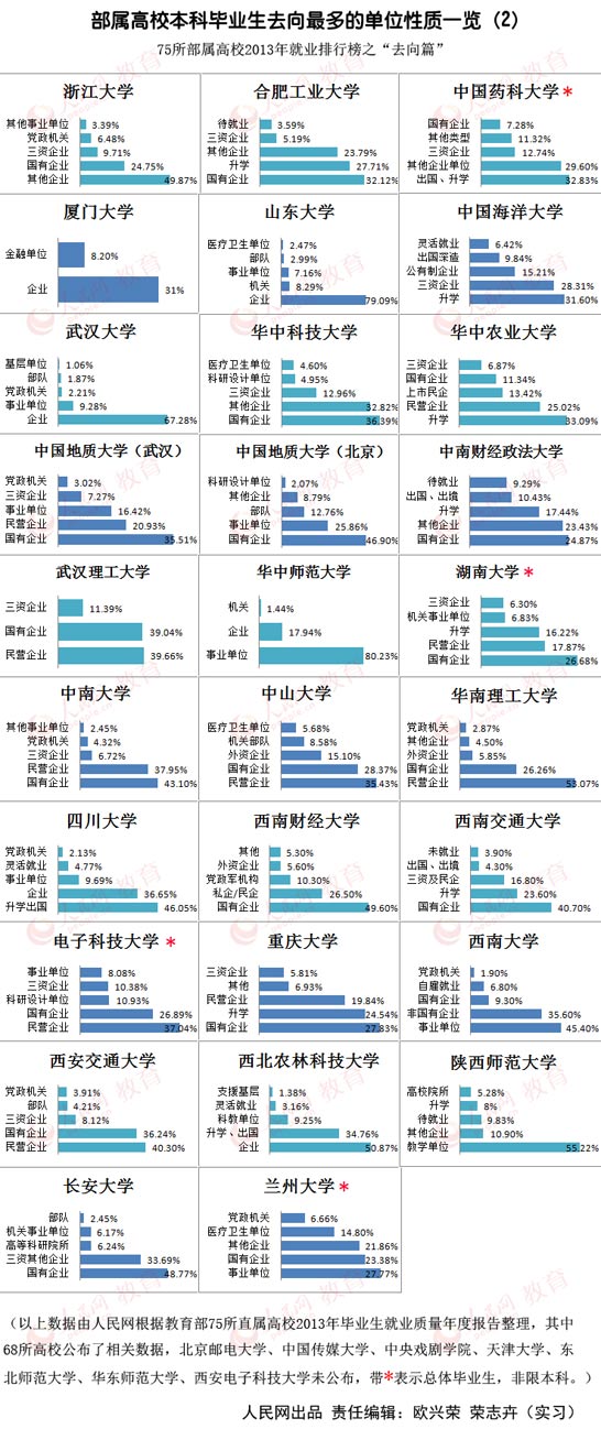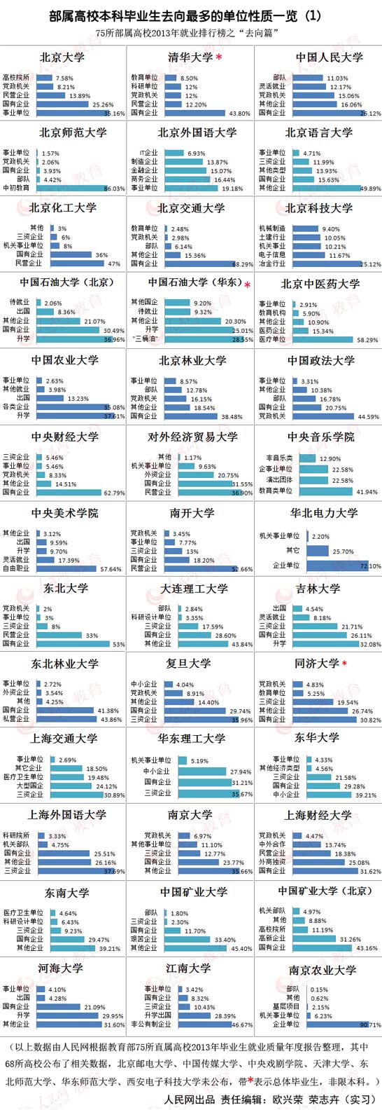 人民網(wǎng)北京5月20日電 (歐興榮 實習(xí)生榮志卉)高校畢業(yè)生就業(yè)都去了哪兒?近日,人民網(wǎng)根據(jù)教育部75所直屬高校發(fā)布的2013年畢業(yè)生就業(yè)質(zhì)量年度報告,整理相關(guān)數(shù)據(jù),編發(fā)本科畢業(yè)生去向最多的單位性質(zhì)分析表,讓我們略窺一二。