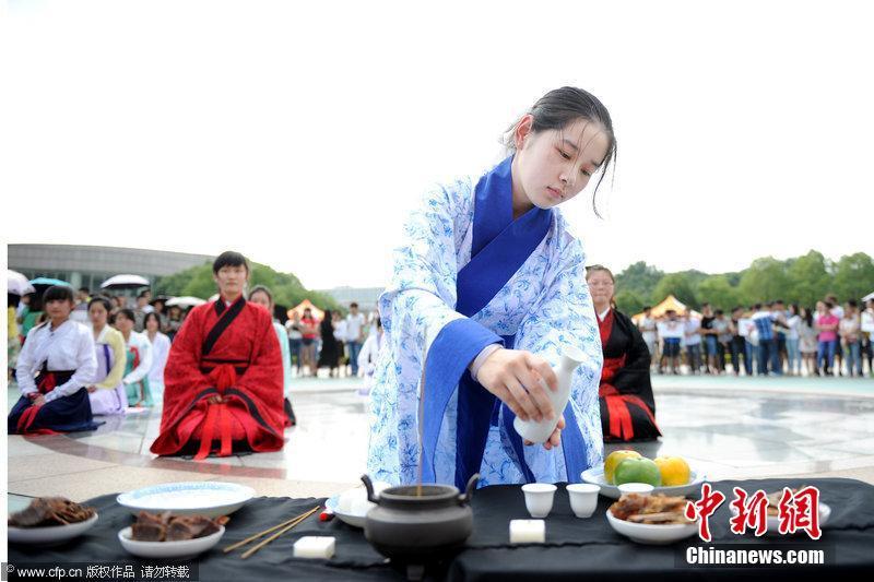 5月22日,武漢,湖北經(jīng)濟(jì)學(xué)院端午文化節(jié)暨首屆龍舟大賽啟動(dòng)儀式上,該校漢滄浪漢服社的30多名同學(xué)們身著漢服,雙手作揖,焚香撫琴,以傳統(tǒng)方式將“古代祭祀”的過程一一展現(xiàn)給師生,用儒家最繁縟的禮儀祭祀屈原,吸引眾多師生駐足觀看。楊宏斌 攝 圖片來源:CFP視覺中國(guó)