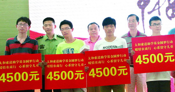 在活動(dòng)現(xiàn)場,考上北京大學(xué)的十堰市理科狀元王珺等10名大學(xué)生分別領(lǐng)到愛心助學(xué)基金4500元及愛心手機(jī)一部,10名留守兒童也分別領(lǐng)到2000元愛心基金?吹綄W(xué)費(fèi)終于有了著落,在場的家長和孩子們都露出了笑容。