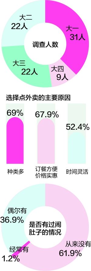 對于這樣的調(diào)查結(jié)果,來自東北的大三學(xué)生小白并不感到意外,她說,每星期除了有三四次是在校外飯館就餐外,其他基本上都靠外賣解決。“我身邊很多同學(xué)都這樣,一個(gè)宿舍一天下來點(diǎn)十來份外賣是常有的事。”