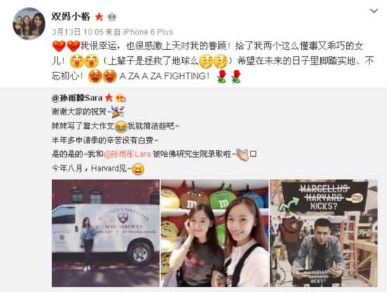 她稱,“要感謝的人有很多,感謝在復旦英語系修過的每一門課程,遇到的每一位老師,讓我對英語的熱愛不斷加深。感謝父母的信任和鼓舞,讓我心中的等待慢慢化為了期待……抒情一下:你好,哈佛。”文末,她還說,“二驢還沒畢業(yè),繼續(xù)寫畢業(yè)論文去啦!”而姐姐孫雨朦則在微博上寫道:“感謝大家的祝賀,半年多申請季的辛苦沒有白費。我和孫雨彤被哈佛研究生院錄取啦。今年八月,哈佛見。”