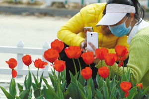 28日并不是周末,但中國(guó)礦業(yè)大學(xué)南湖校區(qū)東門車水馬龍,好不熱鬧。一進(jìn)大門看到,1100平方米的土地上像是鋪了色彩鮮艷的地毯,郁金香在爭(zhēng)奇斗艷,許多游客結(jié)伴前來賞花。為了拍出最美的郁金香,不少攝影愛好者特意帶上專業(yè)相機(jī)和設(shè)備,全副武裝地拍美景。滿頭白發(fā)但身材矯健的張先生說,他今年70歲,是位攝影愛好者,在老年大學(xué)里學(xué)習(xí)攝影,今天特意帶著老伴來賞花拍照,順便來驗(yàn)證一下自己的攝影技術(shù)。