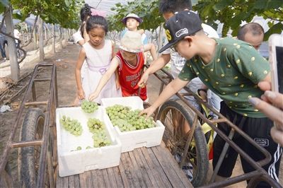 暑期里,全市各地暑期樂園不僅向?qū)W生傳授知識,還組織各種戶外活動,讓學生既鍛煉身體,又體驗生活。圖為前日,海南社區(qū)和育才路社區(qū)的小朋友來到三和羚杰葡萄園采摘、包裝、搬運葡萄,體驗農(nóng)活,感受生活。陳沈華 施藺玲攝