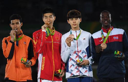 8月17日,冠軍中國選手趙帥(左二)、亞軍泰國選手漢普拉比(左一)、季軍韓國選手金泰勛(右二)與多米尼加共和國選手皮耶在頒獎(jiǎng)儀式上。當(dāng)日,2016年里約奧運(yùn)會(huì)跆拳道男子58公斤級(jí)頒獎(jiǎng)儀式舉行。 新華社記者韓瑜慶攝