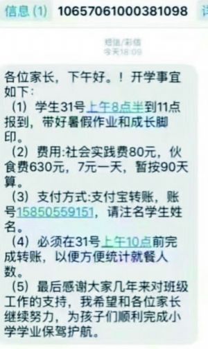 據(jù)了解,有小學(xué)家長反映,接到開學(xué)報(bào)到短信,要求帶作業(yè),并通過支付寶支付社會實(shí)踐費(fèi)和伙食費(fèi)。教育部門人士表示,這是一種新騙術(shù),這條短信和學(xué)校一般發(fā)出的開學(xué)內(nèi)容很像,極具欺騙性。但是,學(xué)校不會通知家長用支付寶交費(fèi)。