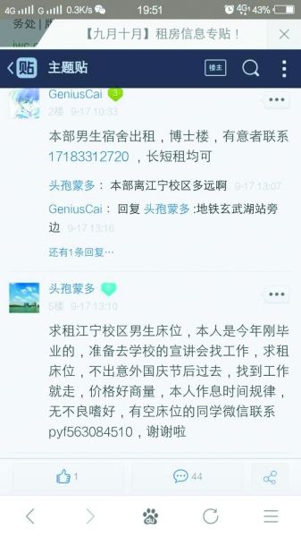 記者登錄西祠胡同、高校論壇以及天涯社區(qū)等網(wǎng)站發(fā)現(xiàn),此類出租床位的信息不在少數(shù)。南京高校的本科生、碩士研究生、博士研究生均有宿舍床位出租。床位均價(jià)約在350元/月,也有部分稍高,達(dá)到500元/月。