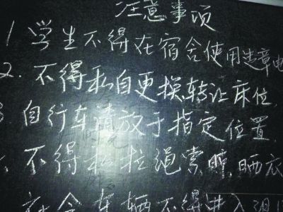 藥大宿舍樓下寫著的規(guī)定。記者 談潔攝