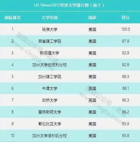 USNews2017年世界大學排行榜中,哈佛大學、麻省理工學院和斯坦福大學位居前三,排名第四到第十的高校是加州大學伯克利分校、加州理工學院、牛津大學、劍橋大學、牛津大學、普林斯頓大學、哥倫比亞大學和加州大學洛杉磯分校。