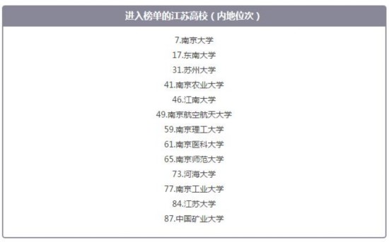 記者盤點發(fā)現(xiàn),87所中國內(nèi)地高校中,江蘇一共有13所高校上榜,分別是:南京大學、東南大學、蘇州大學、南京農(nóng)業(yè)大學、江南大學、南京航空航天大學、南京理工大學、南京醫(yī)科大學、南京師范大學、河海大學、南京工業(yè)大學、江蘇大學和中國礦業(yè)大學。