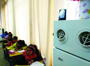 11月9日,在泉山區(qū)星光小學,現(xiàn)代快報記者看到,每間“會呼吸的教室”里都有兩臺空調(diào)一樣的機器,通過塑料管道與室外連通,機器上面擺放著小型的“激光測霾儀”,上面清晰地顯示出當前的PM2.5數(shù)值。雖然機器開動著,但產(chǎn)生的噪音卻很小。