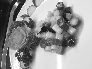 南理工的“話梅排骨”人氣很高。復(fù)旦大學(xué)的展示窗口前,一盤(pán)名叫“五彩繽紛”(上圖)的菜肴引起同學(xué)們圍觀。廚師介紹,食材有秋葵、黑木耳、年糕、方腿、魷魚(yú)、菠蘿,不僅好看,吃起來(lái)也爽口。