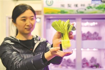 江蘇大學的學生展示“微型植物工廠”種植的蔬菜。微型植物工廠體積小便于操作,在臥室、在辦公桌上也能培植植物。 辛 一攝 視覺江蘇網(wǎng)供圖