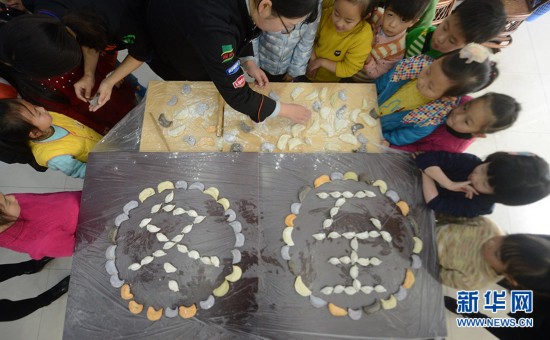 12月20日,揚(yáng)州市杉灣花園社區(qū)開展“包餃子 迎冬至”為主題的活動(dòng),揚(yáng)州大學(xué)旅游烹飪學(xué)院的大學(xué)生們將面里添加胡蘿卜汁、菠菜汁、玉米汁、肉餡等食料做成“彩色餃子”與社區(qū)幼兒園的小朋友一起品嘗餃子,在歡歡樂樂氣氛中迎接二十四節(jié)氣中的“冬至”到來。(孟德龍)