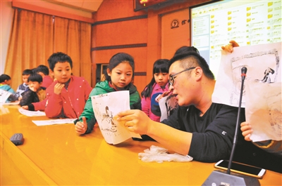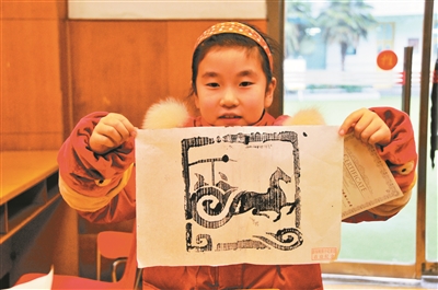 活動中,老師們又帶領(lǐng)學(xué)生現(xiàn)場玩起了拓片的制作。拓片是我國一項古老的傳統(tǒng)技藝,它是使用宣紙和墨汁,將碑文、器皿上的文字或圖案,拷貝出來的一種技能,F(xiàn)場小記者們認(rèn)真觀摩老師的制作過程,并在老師的幫助下完成自己的首件拓片作品。“以前只在博物館看到過這樣的拓片,自己動手做還是第一次。”制作完版畫后,小記者張浩軒同學(xué)十分欣喜,充滿成就感,“親手做版畫讓我感覺更接近歷史了,好像‘穿越’了!”他笑嘻嘻地說,真希望以后能多參加這樣的體驗課。