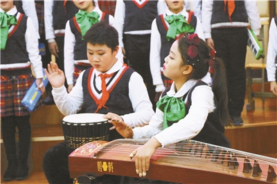媽媽說中國有一句話,爸爸說自己是聽著它長大的……”咦?是哪兒傳來的聲音?嘿,原來是五(6)班在演奏《學習歌》。