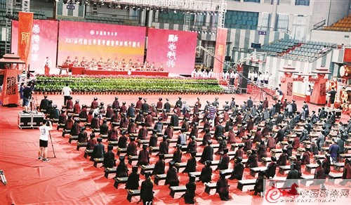 6月15日上午,江蘇師范大學(xué)2017屆碩士研究生畢業(yè)典禮暨學(xué)位授予儀式舉行。該校師生及出席畢業(yè)典禮的教育部領(lǐng)導(dǎo)和校領(lǐng)導(dǎo)身著漢服齊聚一堂,古風(fēng)漢韻貫穿全程。