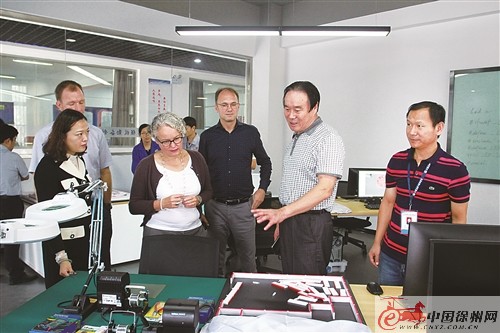 院長唐自強向德國埃爾福特市政府代表團介紹微電腦鼠機器人運行原理。