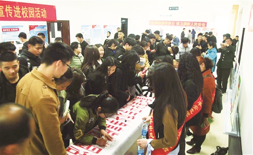 ◎徐州日報全媒體記者 甘曉妹 4月13日,鼓樓區(qū)國安辦、區(qū)掃黑除惡領(lǐng)導(dǎo)小組人員來到徐州工業(yè)職業(yè)技術(shù)學(xué)院,為師生們帶來了一場特殊的法治宣講課。 國家安全離我們有多遠(yuǎn) “到底什么是國家安全?”在宣講現(xiàn)場,鼓樓區(qū)政法委副書記王金龍開門見山,給同學(xué)們講了很多關(guān)于國家安全的小案例。 “反腐拍蠅、巡視巡察、南海爭端、臺灣問題、中美貿(mào)易爭端、中印邊境對峙、反間防諜,甚至網(wǎng)絡(luò)信息、環(huán)保、掃黑除惡專項斗爭等等都可以是國家安全的范疇;文化藝術(shù)類,如《人民的名義》電視劇、《戰(zhàn)狼》、《紅海灘》都可以歸國家安全序列內(nèi)容。”王金龍告訴同學(xué)們,“其實國家安全貫穿于生活方方面面,并不像我們一些人認(rèn)為國家安全與普通老百姓很遠(yuǎn)、無關(guān)。” 王金龍介紹,目前,特別是非傳統(tǒng)領(lǐng)域的國家安全直接關(guān)系到每一個家庭、每一個人,比如網(wǎng)絡(luò)集資詐騙e租寶、徐玉玉案,網(wǎng)絡(luò)上的黃賭毒等,都可能使普通老百姓瞬間傾家蕩產(chǎn),甚至丟掉性命,意識形態(tài)領(lǐng)域受到嚴(yán)重干擾,傳統(tǒng)文化面臨嚴(yán)重威脅。“有些青年好壞不分、是非不分,給自己的人生和社會帶來嚴(yán)重問題。” “原來國家安全涉及面這么廣,之前我還認(rèn)為只在軍事、戰(zhàn)爭、國防、間諜等領(lǐng)域。”該校工商管理學(xué)院學(xué)生趙凱坐在臺下感嘆。 大學(xué)生要積極參與國家安全 “大學(xué)生作為中國特色社會主義事業(yè)的建設(shè)者和接班人,更應(yīng)成為國家安全和利益的自覺維護者,掃黑除惡斗爭的積極參與者,從自身做起,自覺投入到黨的召喚和社會各項事業(yè)和工作中去。”王金龍建議大學(xué)生們要牢固樹立國家利益高于一切的觀念;要密切關(guān)注國際斗爭形勢,增強敵情觀念和防范意識;要努力掌握國家安全的有關(guān)法律、法規(guī),要積極配合國家安全機關(guān)的工作。 “大家還要加強法律知識學(xué)習(xí),認(rèn)識什么是‘黑惡勢力’,如何面對‘黑惡勢力’,并積極舉報黑惡犯罪線索,舉報身邊校園黑惡勢力,學(xué)會運用法律武器維護自身合法權(quán)益,一旦受到相關(guān)黑惡勢力的侵害,及時向公安機關(guān)報案,不能忍氣吞聲,避免遭受更大傷害。” 宣講結(jié)束后,徐州工業(yè)職業(yè)技術(shù)學(xué)院的師生們還集體收看了國安宣傳片,并在宣傳條幅上簽下了自己的名字。“國家、社會的安全穩(wěn)定是我們所有人學(xué)習(xí)和生活的前提和保障。”學(xué)生張玥表示,“國家安全教育很有意義,希望今后多開展這樣的活動。” 國家安全就在你我身邊 “此次全民國家安全教育周暨掃黑除惡專項斗爭宣傳進校園活動,讓廣大師生對國家安全有了新的認(rèn)識,深刻了解到國家安全與我們每個人都息息相關(guān),培養(yǎng)和增強了大學(xué)生投身國家安全事業(yè)的責(zé)任感與使命感。”徐州工業(yè)職業(yè)技術(shù)學(xué)院副院長朱作付表示,在宣講結(jié)束后,學(xué)校將充分利用多種途徑進行宣傳、推廣,以營造濃厚氛圍,確;顒有Ч “今天的活動只是全民國家安全教育周系列活動的一部分,為了強化宣傳發(fā)動,鼓樓區(qū)已經(jīng)在街道社區(qū)、車站碼頭、集貿(mào)市場、機關(guān)學(xué)校、企事業(yè)單位等重點部位、場所廣泛張貼相關(guān)宣傳海報,從商業(yè)廣場、超市、沿路門店、居民小區(qū)等點線面,全方位宣傳掃黑除惡工作。”王金龍表示,鼓樓區(qū)還將積極利用互聯(lián)網(wǎng)、手機短信等新聞媒體多角度宣傳掃黑除惡斗爭,力爭做到家喻戶曉、人人皆知、群眾參與。 |