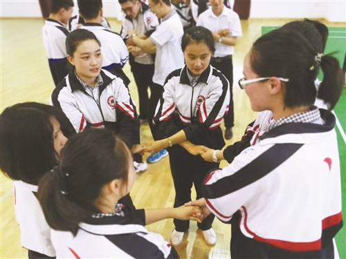在剛開始的“團隊破冰”環(huán)節(jié),同學們還有點扭扭捏捏的不好意思,不過五分鐘以后,現(xiàn)場的氛圍就開始升溫了。“AB互換”是將交叉連接的雙手變成不交叉的連接,這個看似簡單的任務,實則不簡單,需要小組的合作探究,還需要反復的驗證,一個40多人的大圈子要完成這個任務往往需要花費很長時間。但是令在場見多識廣的教練想不到的是,有一個班級僅用了不到五分鐘的時間就解開了,當40多位同學迅速而有序地穿梭、轉圈,解開“手鏈”的那一刻,教練和同學們一起鼓掌歡呼。這時候,“團隊”“合作”“溝通”“創(chuàng)新思維”這些詞都已經(jīng)在同學們的腦海中扎下了根。