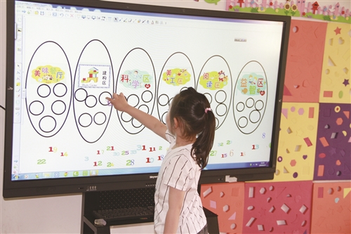 記者看到,一個正在“快遞”游戲的中班孩子玩得差不多了,站起來走向了教室一角的一體機,點擊一下屏幕,頁面出現(xiàn)了六個區(qū)域分布圖,只見孩子分別數(shù)了數(shù)每個區(qū)域的人數(shù),用手指把自己從快遞站的圖片中,輕拖放入了汽車城。接下來,走進汽車城拿起一輛小汽車,開心地和其他小伙伴玩了起來……“這是我們園新近開發(fā)的幼兒自主選區(qū)特色項目”,金文園長告訴記者:“作為省課程游戲化建設單位,二實幼一直在探索幼兒園自主游戲開展的最佳途徑,這種運用數(shù)字化資源進行自主選區(qū)的操作不僅讓孩子們游戲興趣大增,也培養(yǎng)了孩子們互聯(lián)網(wǎng)時代的信息化素養(yǎng)。”